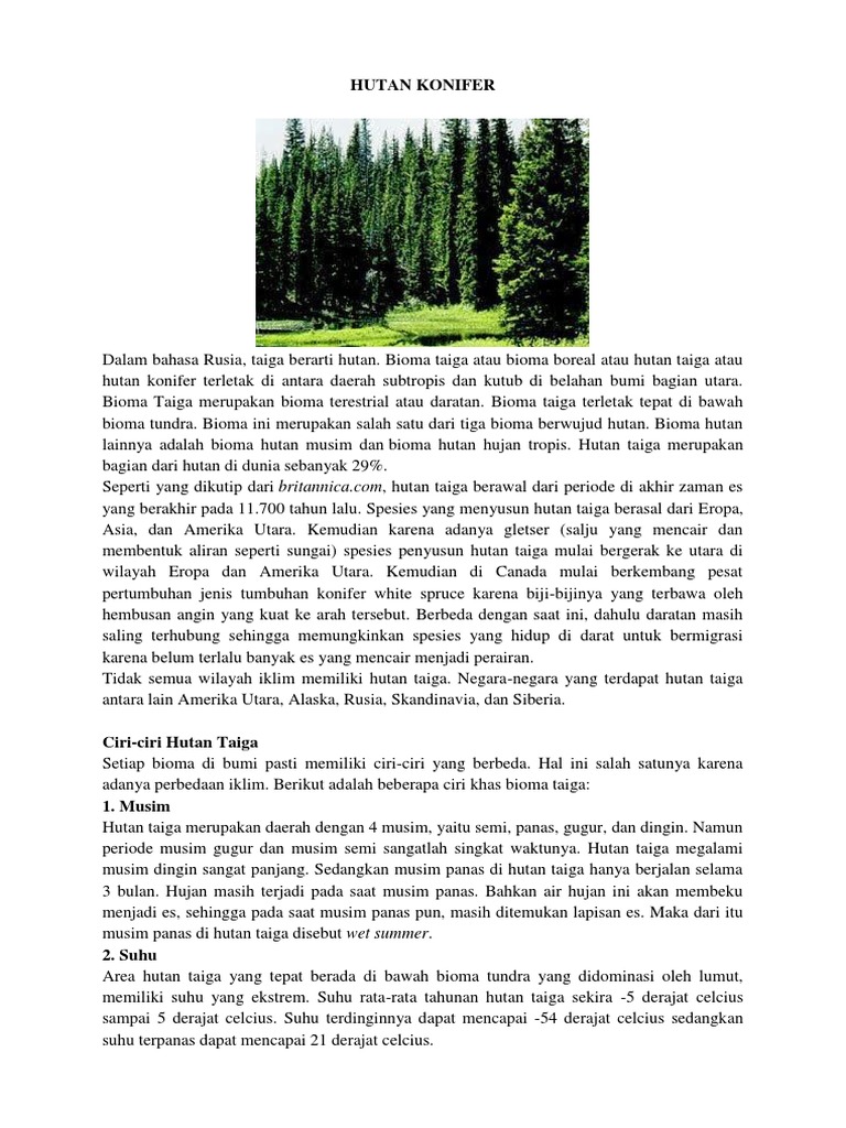Hutan konifer juga tumbuh di kawasan tropika tetapi tidak ada tempat yang membentuk lebih kurang sebidang kawasan yang setara dengan taiga dan jenis pohon di sana tidak banyak persamaan dengan yang biasa kita gunakan. Hutan konifer ini meliputi jarak 6 juta batu persegi dan selebar 1000 batu di tempat-tempat. Hutan konifer hutan monsun tropika hutan daun luruh sederhana Question 7 30 seconds Q.